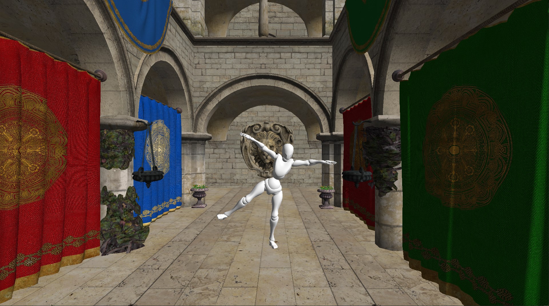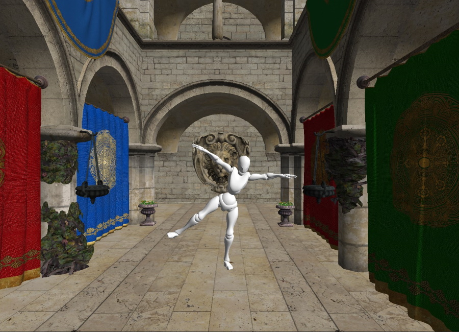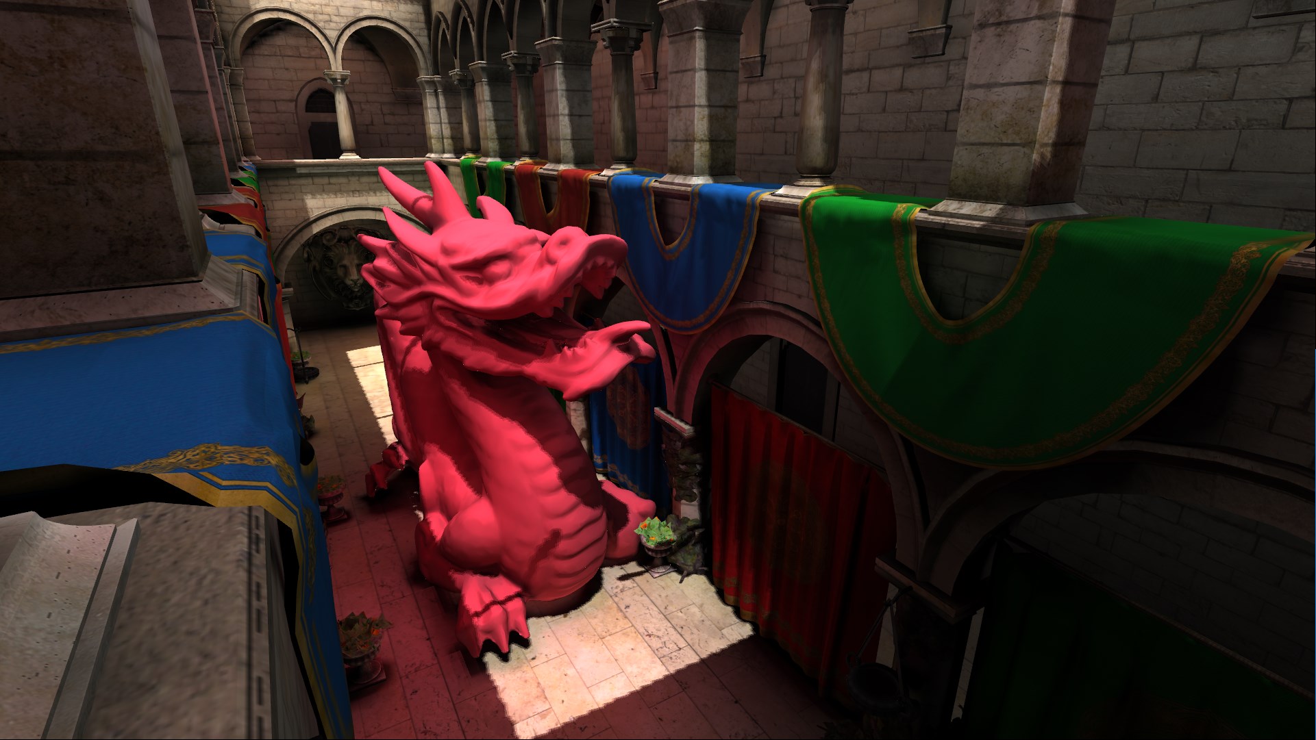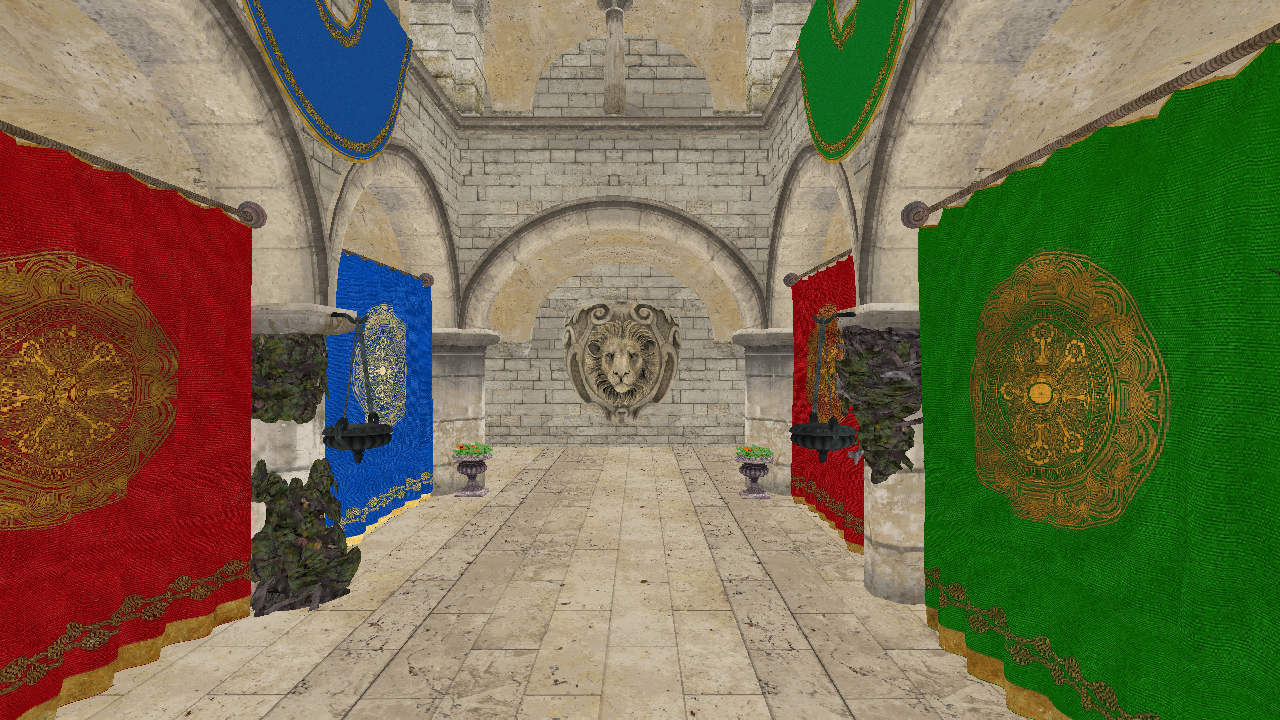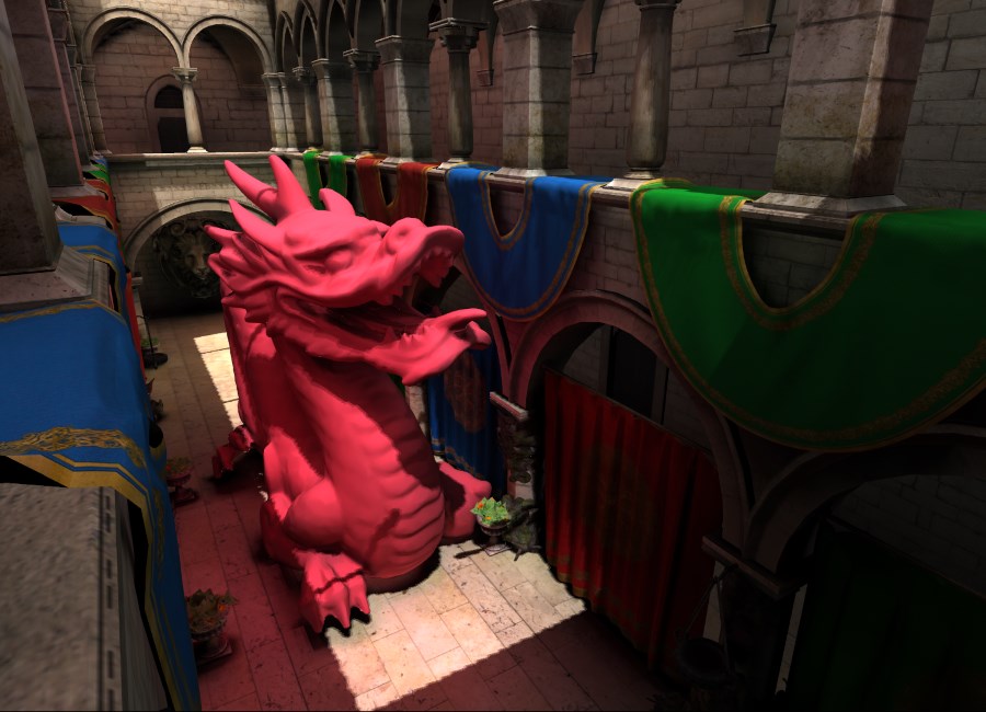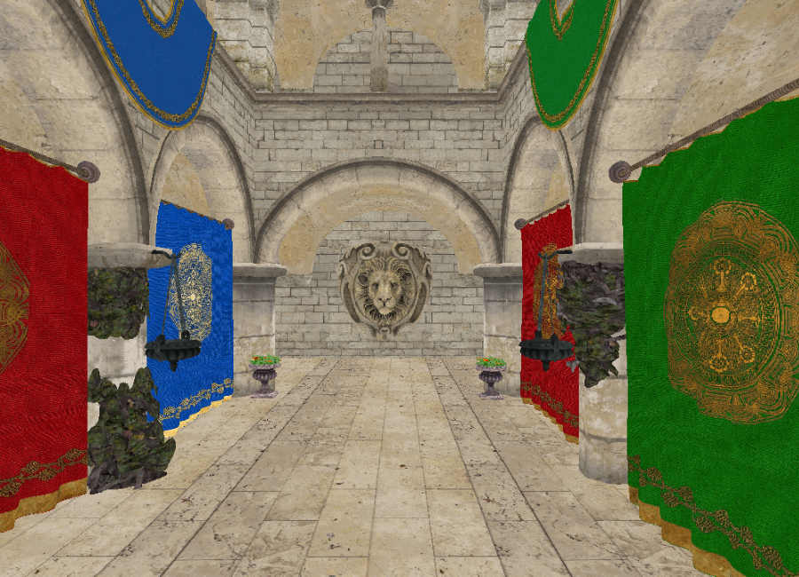 This project is a work in progress. The goal is to create a voxel cone tracer that runs in real time and is able to handle almost any scenes. The current implementation is written in C++ and uses OpenGL. It runs the scene displayed above at around 6 FPS on a resulution of 1280x720. Almost no optimizations have been done so far. I will be working on this project for the rest of the school year. My plan is to further improve the quality and performance by implementing: anisotropic voxels, cascaded voxels, deferred rendering, and specular reflections. This project will also be integrated into an engine that is being developed by other students.