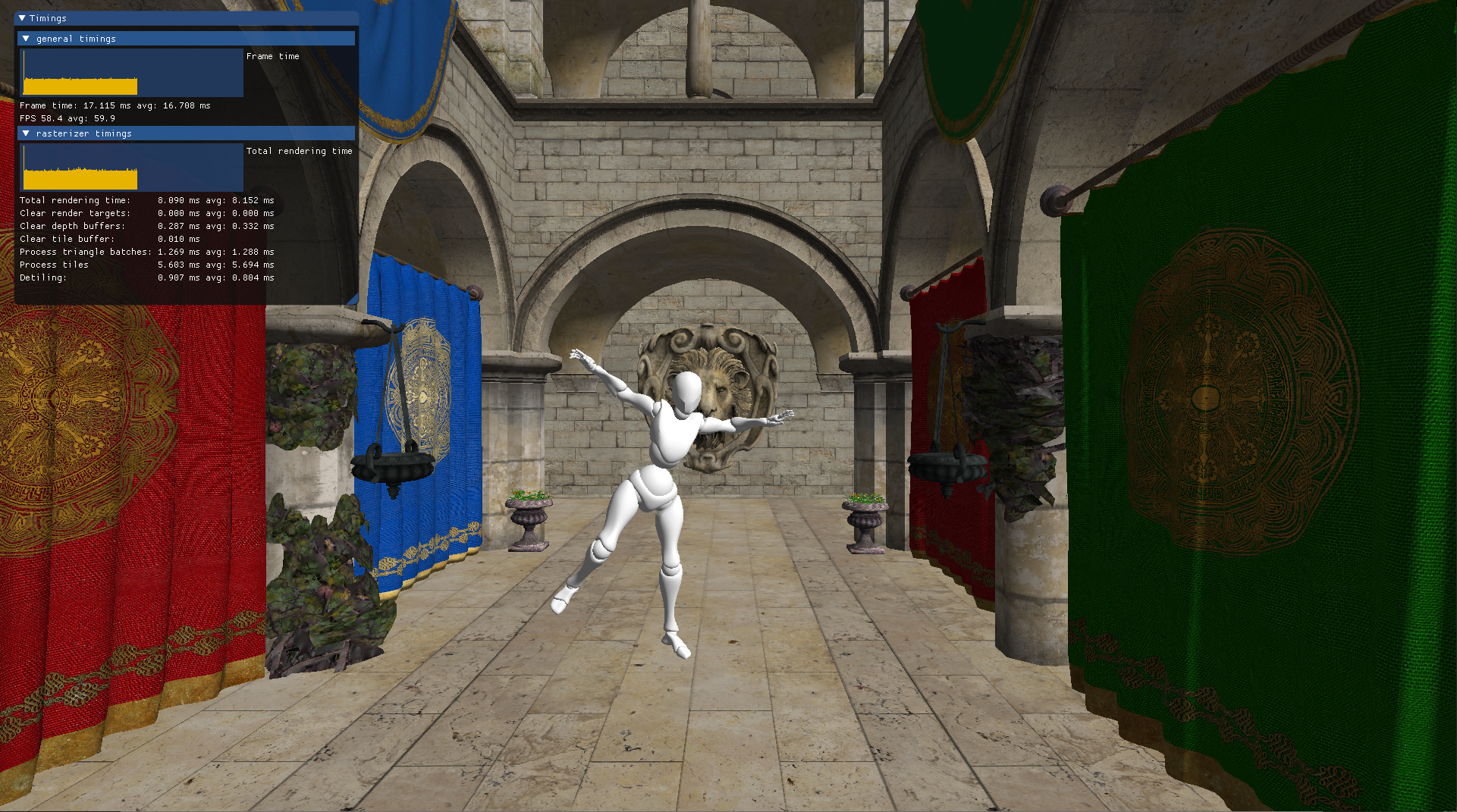 This is a side project that I mostly worked on while travelling to and from work by train. It uses a tile based rendering system like in mobile GPUs, because of the low memory bandwidth constraint on CPUs.