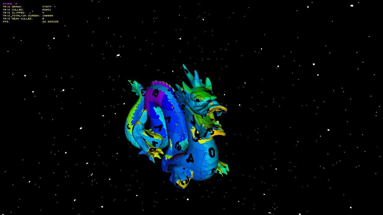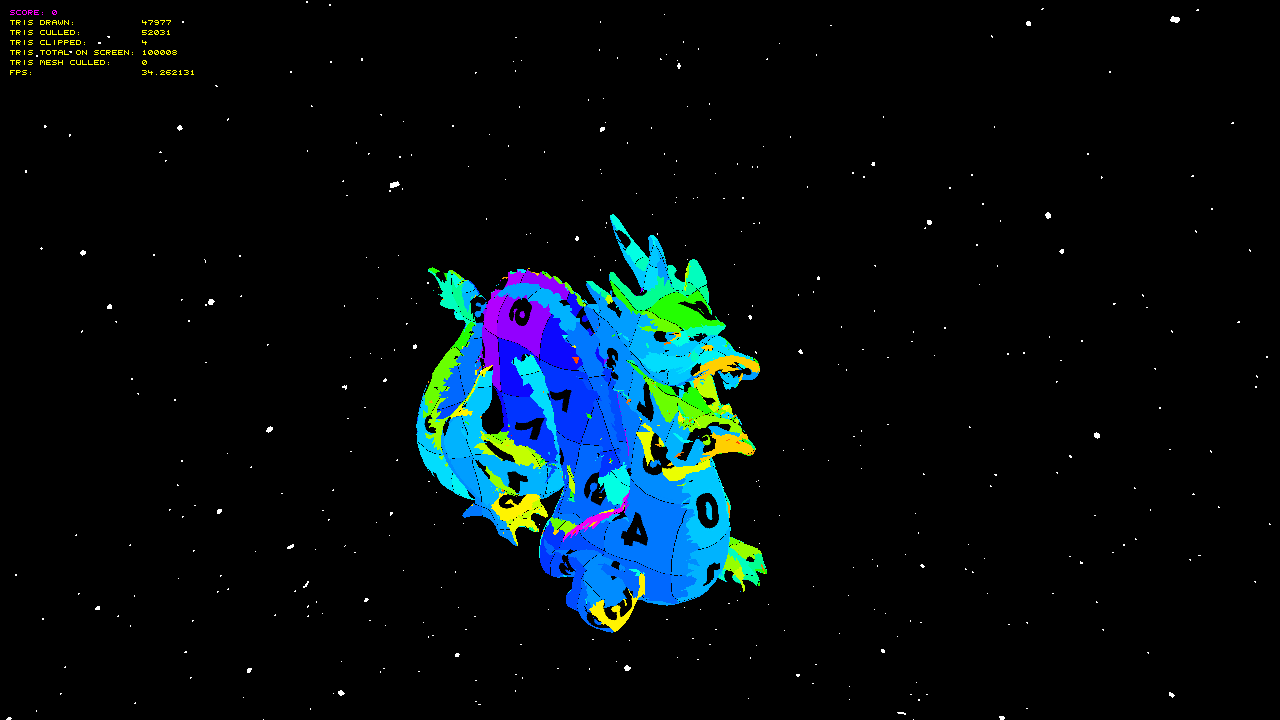 This project was part course about software rasterization. The goal was to write a software rasterizer that could render 100K triangles at 50 FPS with a screen resolution of 512x384. Back face culled triangles counted towards the triangle count. One of the requirements was that also a minimal game had built using the software rasterizer.
